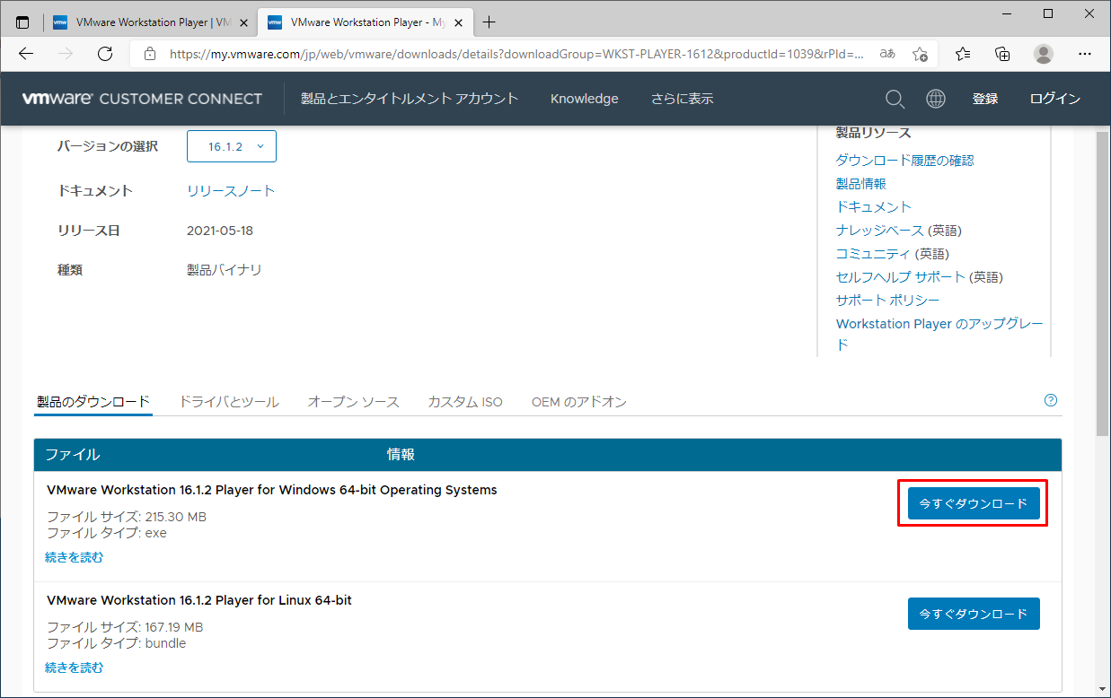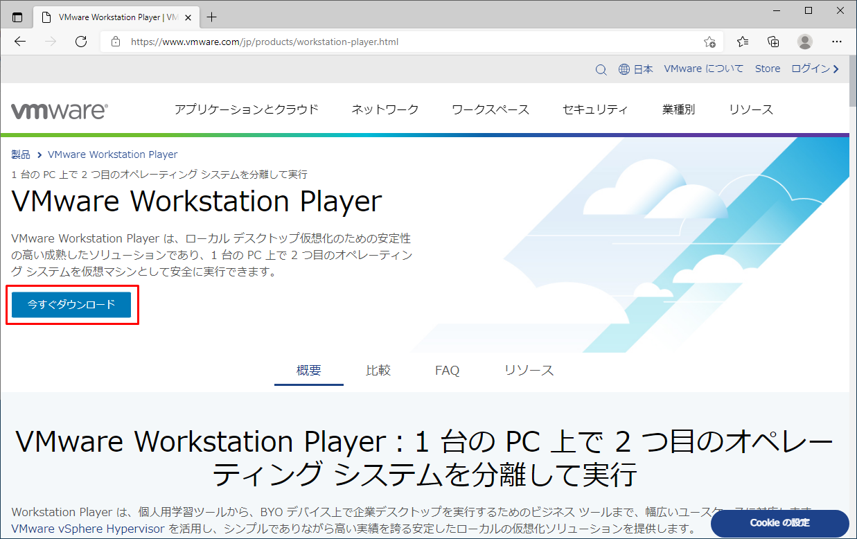 ここでは、仮想マシンを作成するソフトウェア、「VMware Workstation Player」のダウンロード手順を掲載しています。